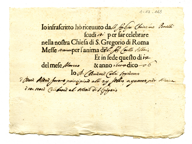 Ricevuta per la celebrazione di 100 messe in suffragio di Carlo Albani (1684 marzo 14)