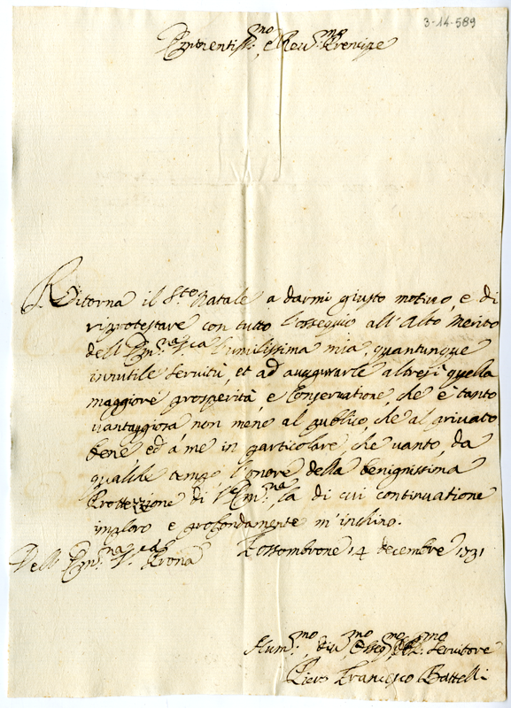 Lettera di Pier Francesco Battelli al cardinale Annibale Albani (1731 dicembre 14)