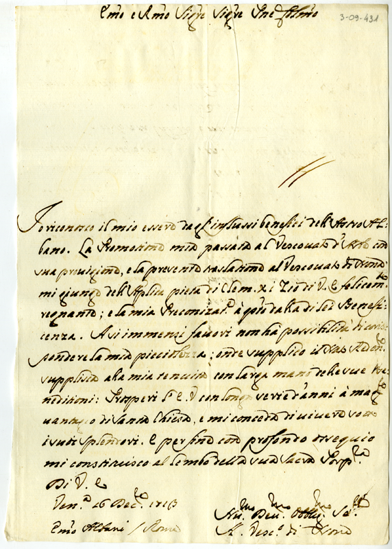 Lettera del vescovo di Nona al cardinale Annibale Albani (1713 dicembre 16)
