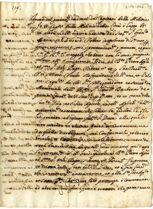 Forma del giuramento che i capitani delle milizie del ducato di Urbino dovranno offrire a monsignor Virile e al cardinale Antonio Barberini dopo la devoluzione del ducato di Urbino.