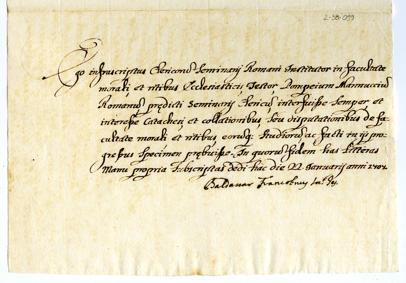 Attestato in favore di Pompeo Mannucci rilasciato da Baldassarre Frocolini (17007 gennaio 22)
