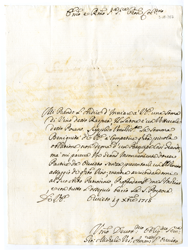 Lettera di Giovanni Michele vescovo amministratore di Orvieto ad Annibale Albani (1718 dicembre 19)