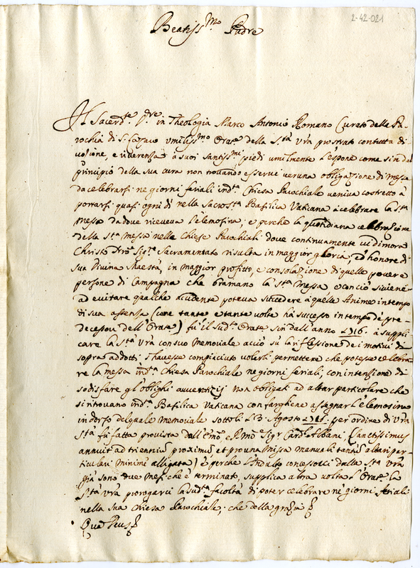 Lettera di Marco Antonio romano curato della chiesa di San Lazzaro fuori le mura a papa Clemente XI (1700-1721)