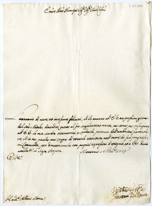 Lettera di Giacomo Baldrati al cardinale Annibale Albani (1729 dicembre 15)