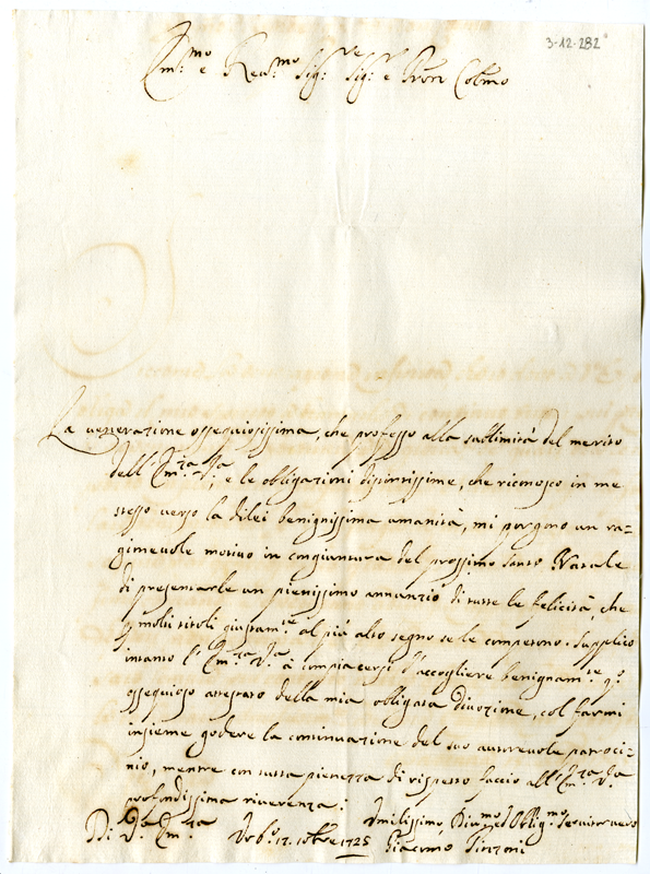 Lettera di Giacomo Pinzoni al cardinale Annibale Albani (1725 dicembre 17)