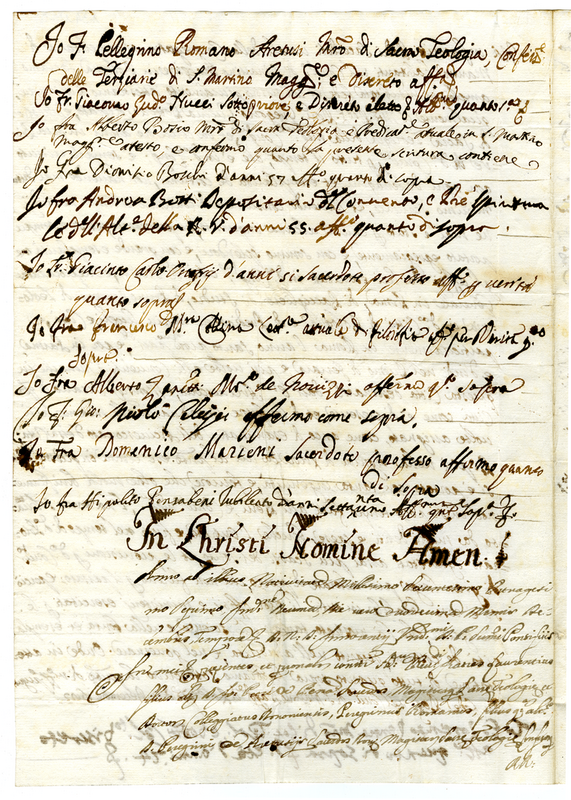Attestazione di buona condotta del priore Domenico Gregorio Gulina sottoscritta dai sacerdoti del convento di San Martino Maggiore in Bologna (1697 dicembre 12)