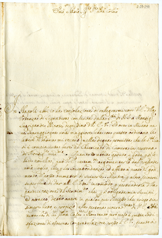 Lettera di Giuseppe Ferdinando Belancini al cardinale Sacripanti (1721 febbraio 18)