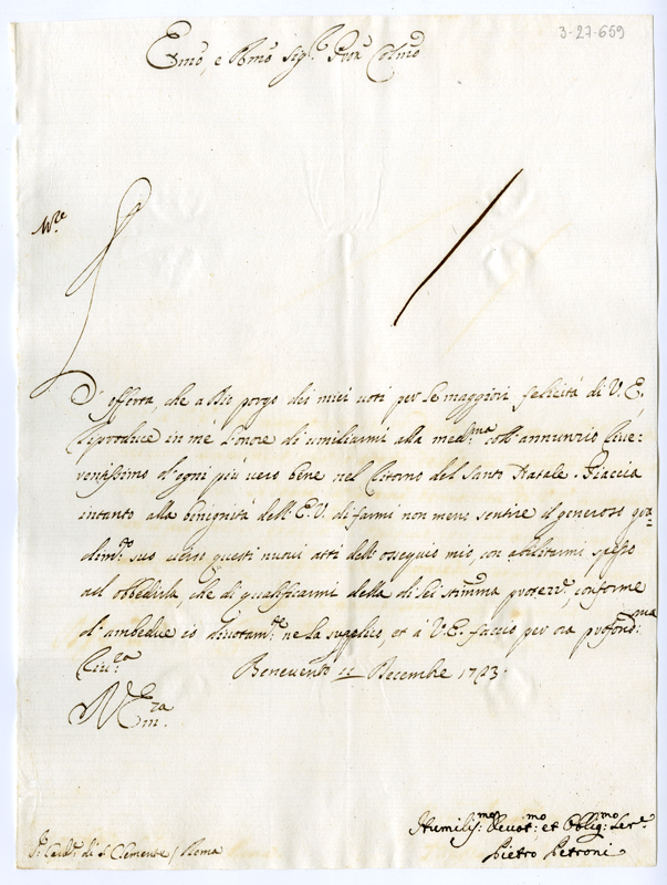 Lettera di Pietro Petroni al cardinale Annibale Albani (1723 dicembre 11)
