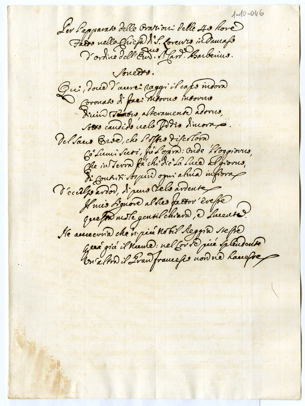 Per l'apparato delle orazioni delle 40 hore fatto nella chiesa di S. Lorenzo in Damaso d'ordine dell'Eccellentissimo Signor Cardinale Barberino. Sonetto.