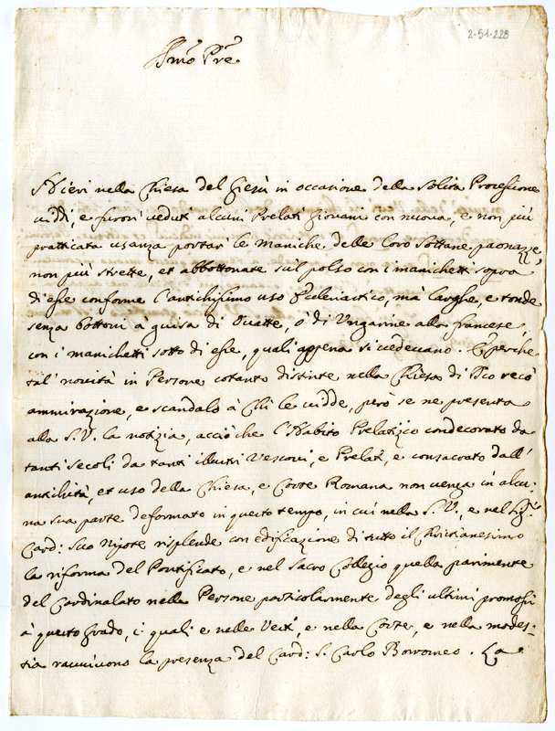 Lettera di denuncia sulla nuova usanza di alcuni giovani prelati di portare le maniche delle sottane non più strette ed abbottonate secondo l'antichissimo uso ecclesiastico