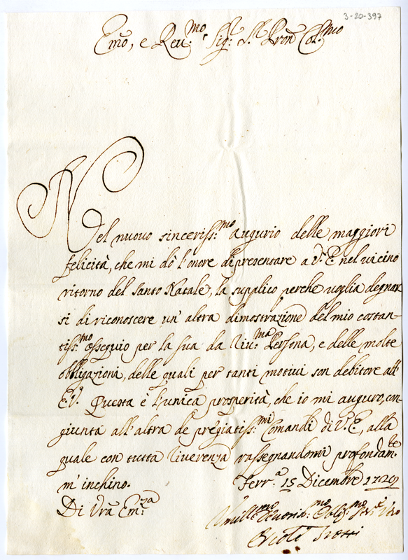 Lettera di Ercole Trotti al cardinale Annibale Albani (1728 dicembre 15)