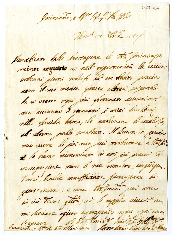Lettera di Pietro Pielo primicerio di San Marco al cardinale Annibale Albani (1719 dicembre 17)