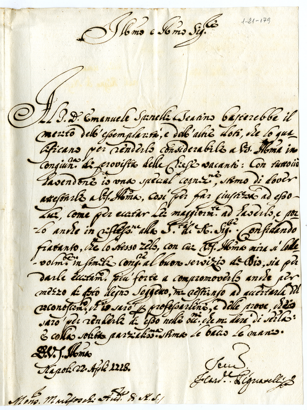 Raccomanda il padre Emanuele Spinelli teatino, per una chiesa vacante nel Regno di Napoli
