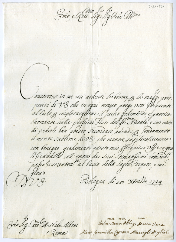 Lettera di Maria Camilla Caprara Marsiglii Doglioli al cardinale Annibale Albani (1729 dicembre 10)