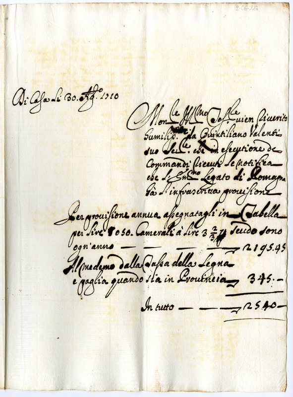 Lettera di Quintiliano Valenti al Tesoriere (1710 agosto 30)
