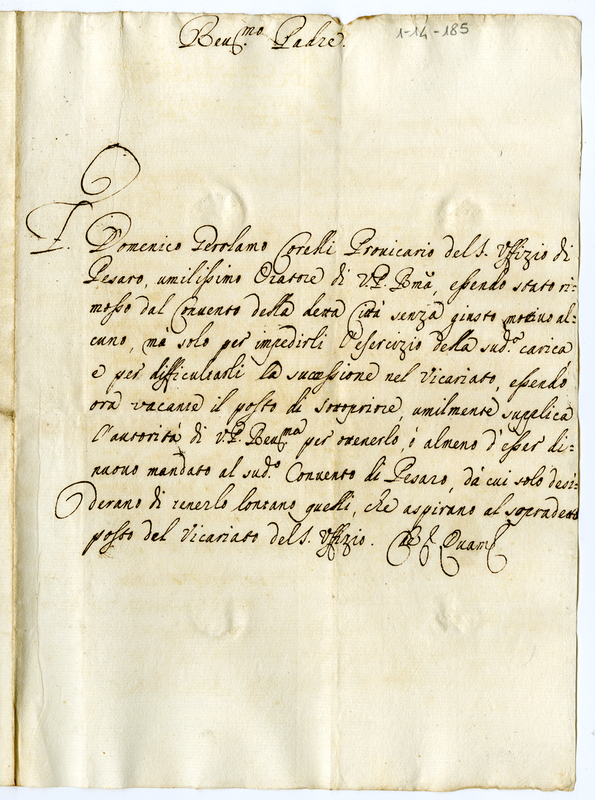 Deomenico Gerolamo Corelli chiede di essere incaricato del sottopriorato presso il convento di Pesaro da cui era stato ingiustamento cacciato