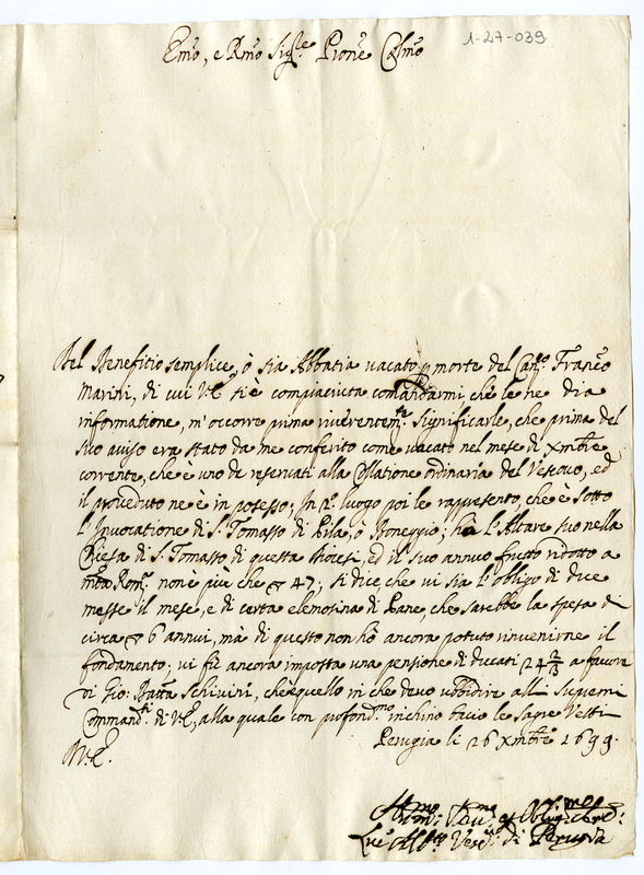 Lettera di Luc'Alberto Vescovo di Perugia ad un Cardinale (1699 dicembre 26)