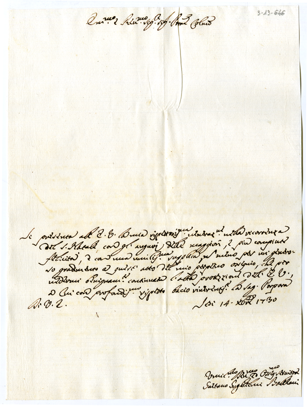 Lettera di Gaetano Guglielmi Balleani al cardinale Annibale Albani (1730 dicembre 14)