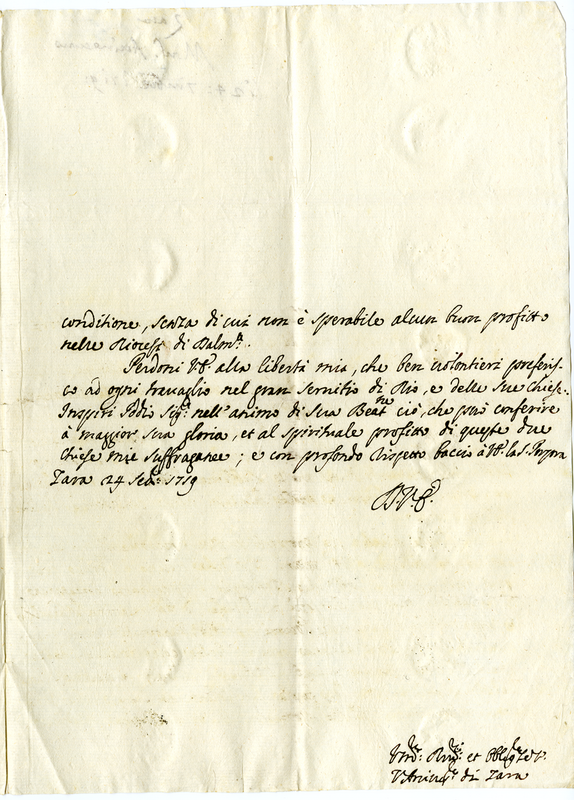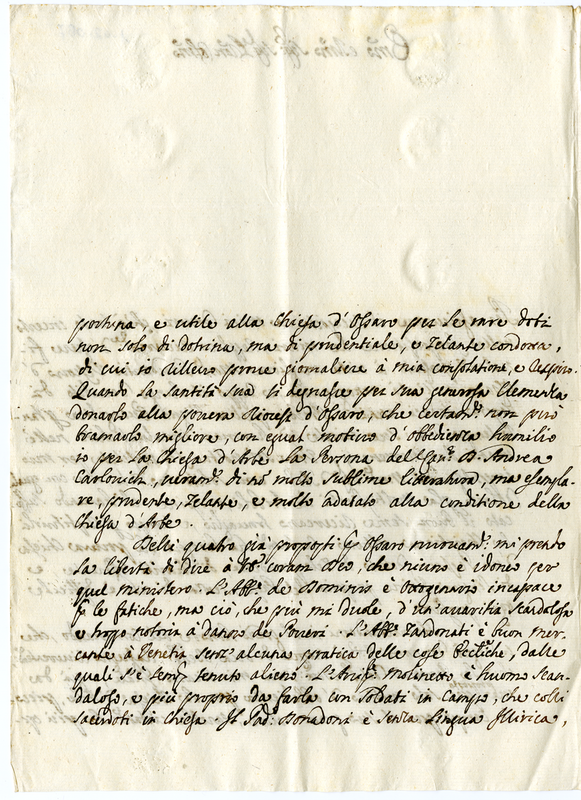 Suggerimenti dell'arcivescovo di Zara per la nomina del dott. Zeni alla chiesa di Ossero.