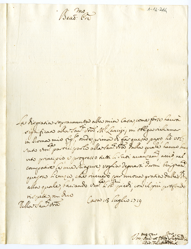 Lettera di Giovanni Felice Abbati a Clemente XI (1719 luglio 13)
