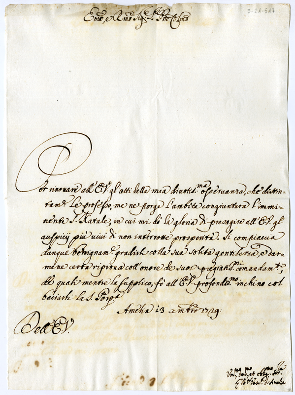 Lettera di Giovanni Battista vescovo di Amelia al cardinale Annibale Albani (1729 dicembre 13)