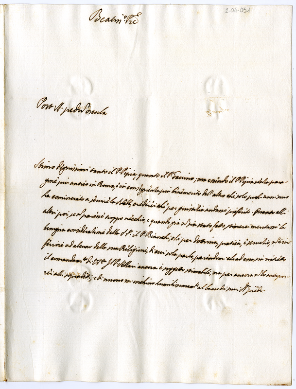 Lettera al Pontefice sui meriti di Padre Pipia e Padre Gavino. Si Preferirebbe Pipia per anzianità (1700-1721)