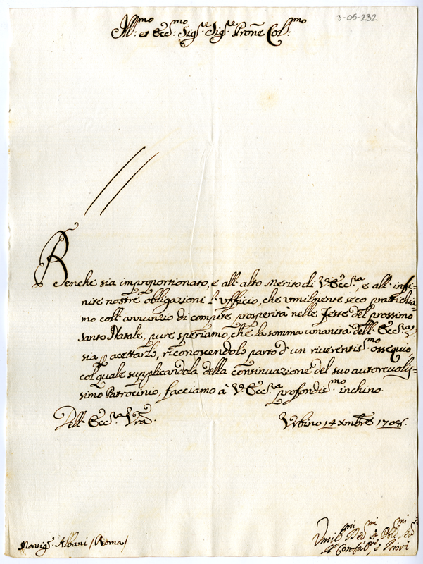 Lettera del confaloniere e priori di Urbino ad Annibale Albani (1708 dicembre 14)
