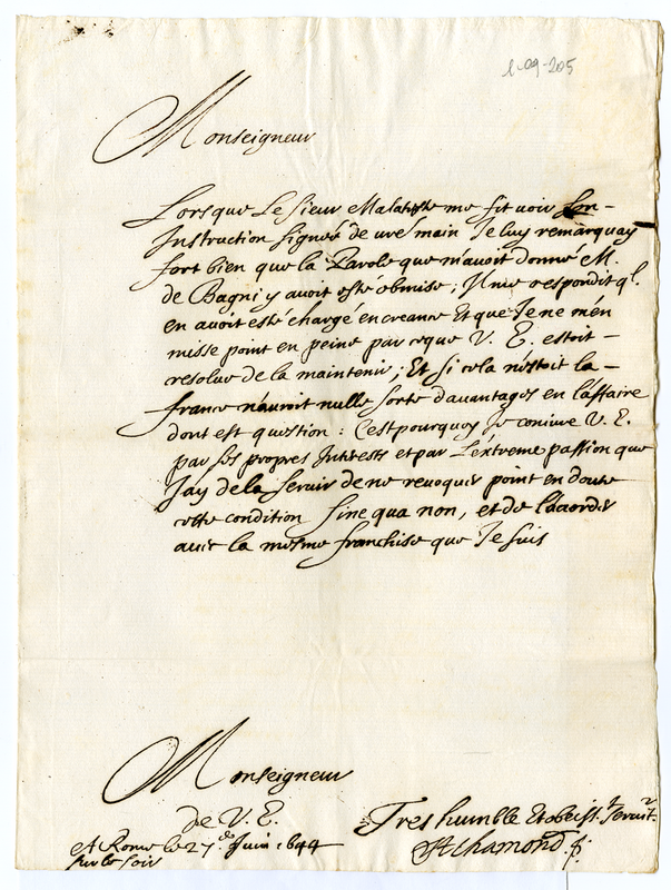 Lettera del marchese di Saint Chamond al cardinale Barberini Francesco (1644 giugno 27)