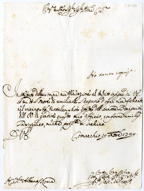 Lettera di Francesco vescovo di Comacchio al cardinale Annibale Albani (1720 dicembre 10)