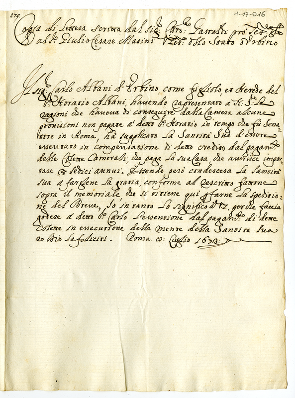 Copia di lettera scritta dal cardinale Gastaldi pro-tesoriere generale al Sig. Giulio Cesare Masini (1673 luglio 8)