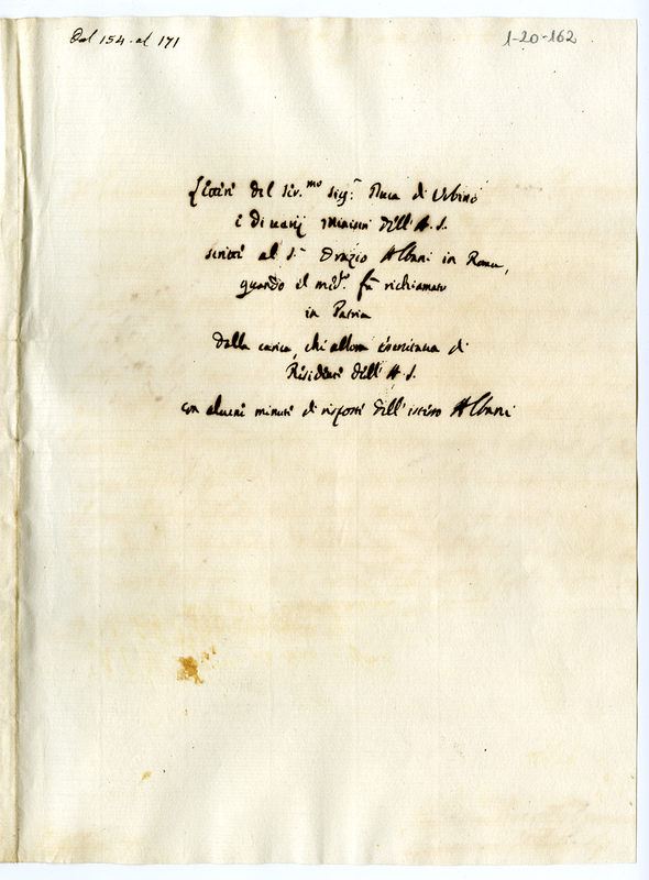 Lettere del Serenissimo Signor Duca di Urbino e di vari ministri dell'Altezza Serenissima scritte al Signor Orazio Albani in Roma, quando il medesimo fù richiamato in Patria dalla carica, che allora ..... di Residente dell'Altezza Serenissima ed alcune minute di risposta dell'istesso Albani (1626)