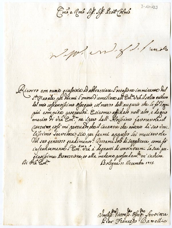 Lettera di Pier Francesco Battelli al cardinale Annibale Albani (1715 dicembre 11)