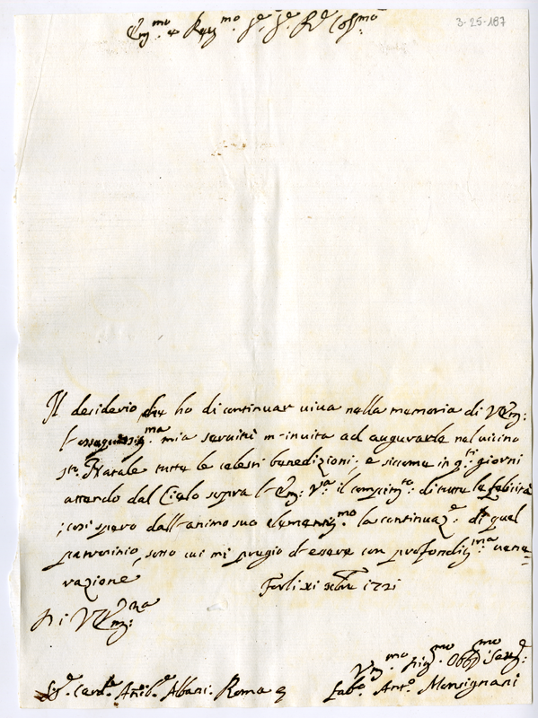 Lettera di Fabrizio Antonio Monsignani al cardinale Annibale Albani (1721 dicembre 11)
