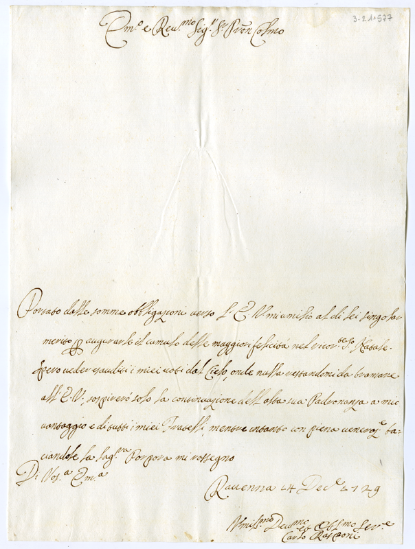 Lettera di Carlo Rasponi al cardinale Annibale Albani (1729 dicembre 14)