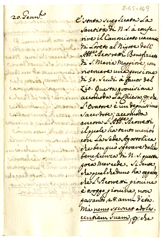 Concessione di un canonicato vacante di Loreto al nipote dell'abate Accorretti con riserva di pensione di 50 scudi in favore dello zio (1700-1721)