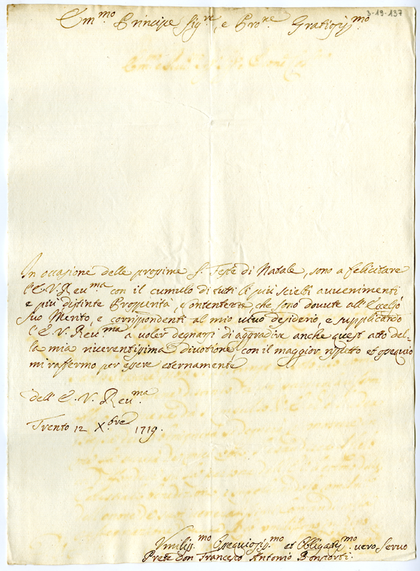 Lettera del prete don Francesco Antonio Bonporti ad Annibale Albani (1719 dicembre 12)