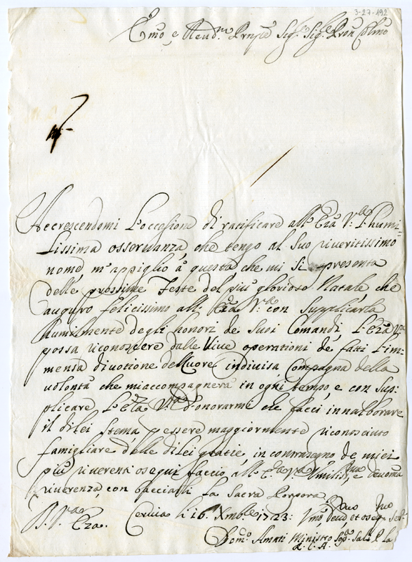 Lettera di Domenico Amati al cardinale Annibale Albani (1723 dicembre 16)