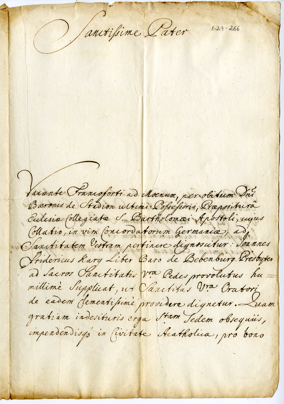 | dc.description | Supplica il Pontefice di potergli assegnare la Prepositura della chiesa collegiata di San Bartolomeo Apostolo di Francoforte sul Meno per morte del Barone di Stadion | |
