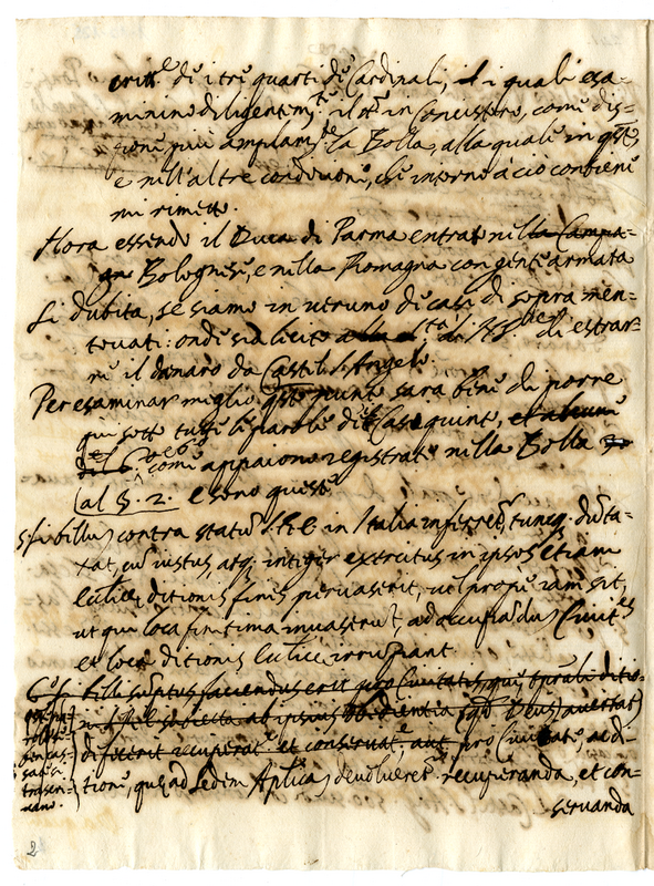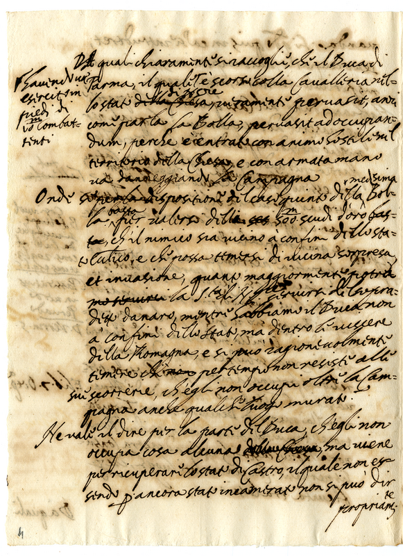 Esprime parere favorevole sulla possibilità di usare i denari vincolati in Castel Sant Angelo con bolla di papa Sisto V a causa della invasione del bolognese e delle romagne da parte del duca di Parma