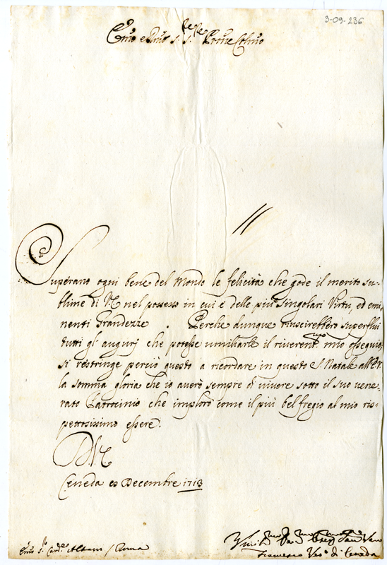 Lettera di Francesco vescovo di Ceneda al cardinale Annibale Albani (1713 dicembre 8)