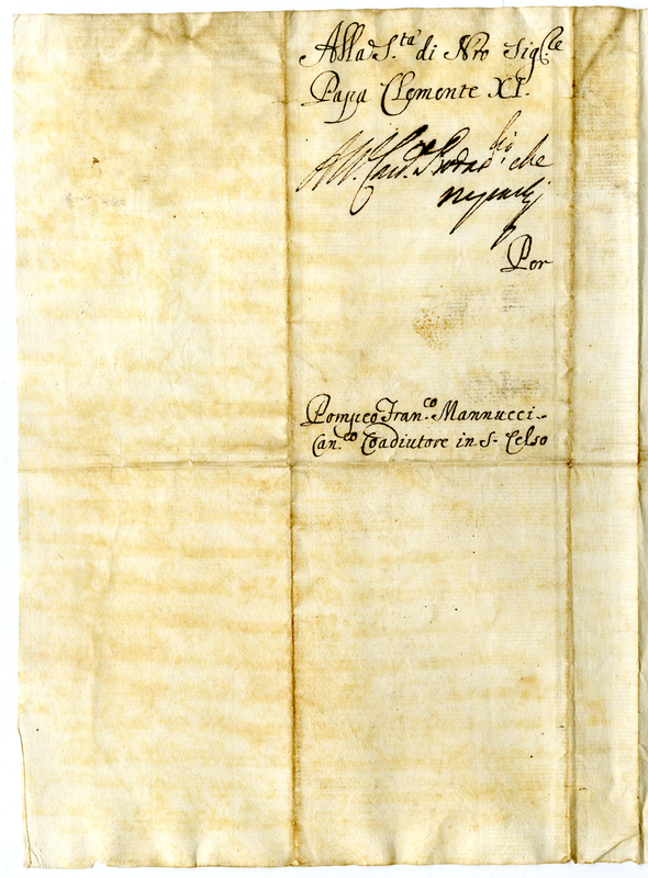Lettera di Pompeo Francesco Mannucci canonico coadiutore in San Celso a papa Clemente XI (1700-1721)