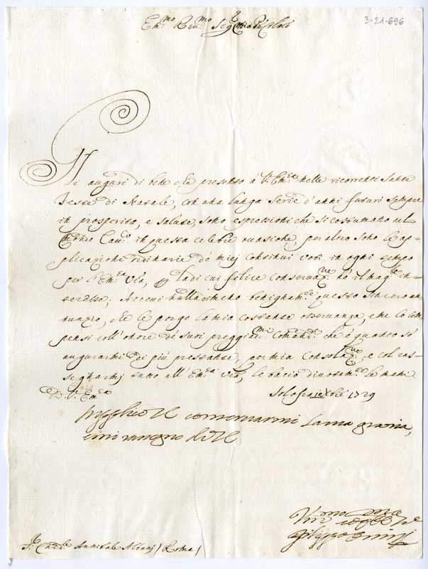 Lettera di Filippo Onofri al cardinale Annibale Albani (1729 dicembre 10)