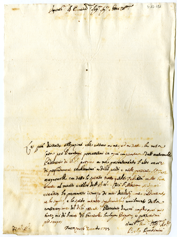 Lettera di Bello Rondinini al cardinale Annibale Albani (1725 dicembre 16)