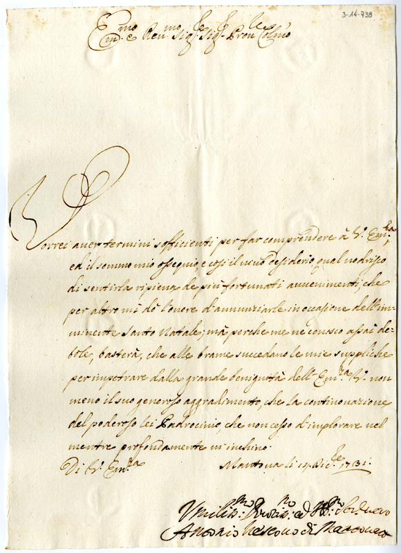 Lettera di Antonio vescovo di Mantova al cardinale Annibale Albani (1731 dicembre 14)