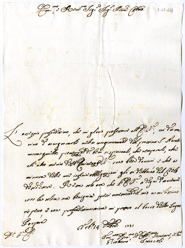 Lettera di Girolamo Staccoli al cardinale Annibale Albani (1731 dicembre 14)