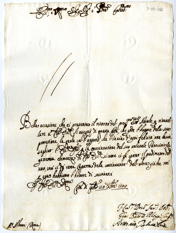 Lettera di Giovanni Battista Aloigi e Antonio Galantara ad Annibale Albani (1708 dicembre 20)