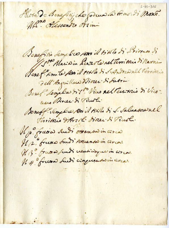 Nota de Beneficii che godeva la buona memoria di Monsignor Illustrissimo Alessandro Orsini (1698 novembre 8)