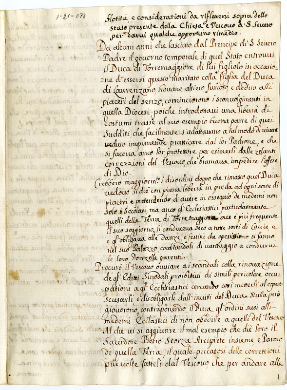 Notizie e considerazioni da riflettersi sopra lo stato presente della chiesa e vescovo di San Severo per darvi qualche opportuno rimedio (1700-1721)