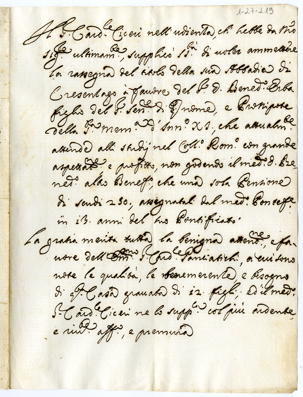 Lettera del Cardinale Ciceri al Cardinale Panciatici (1686-1694)