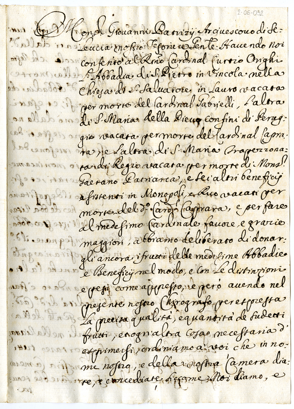 Chirografo di Papa Clemente XI a favore del Cardinale Curzio Origo indirizzato a Monsignor Patrizi tesoriere generale (1712 novembre 16)